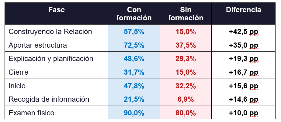 Y sin embargo, incluso en el grupo formado, esta fase se cumple en poco más de la mitad de los casos. Lo que confirma que no es algo que se aprenda de forma espontánea ni que se consolide solo con la práctica clínica.